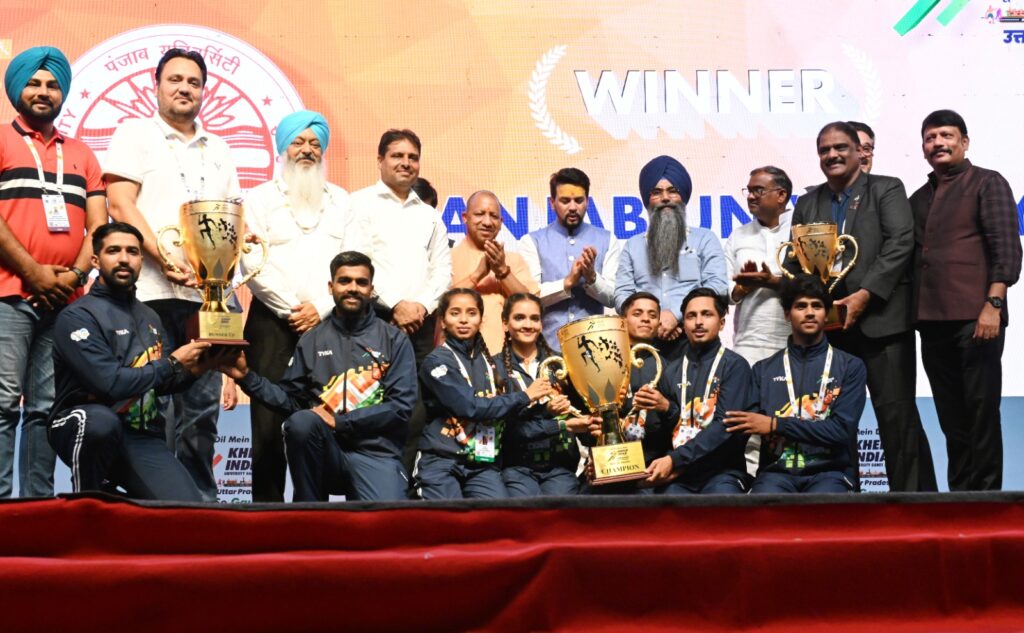 वाराणसी/लखनऊ। 25 मई से 3 जून तक उत्तर प्रदेश के चार शहरों में आयोजित खेलो इंडिया यूनिवर्सिटी गेम्स के तीसरे संस्करण का शनिवार शाम वाराणसी में समापन हो गया। इस अवसर पर सीएम योगी स्वयं उपस्थित रहे। ओडिशा के बालासोर में हुए रेल हादसे के कारण सीएम के निर्देश पर समापन समारोह को सादगी के साथ मनाया गया। इस अवसर पर सीएम योगी ने कहा कि खिलाड़ियों ने गर्मी की परवाह किए बगैर जिस तरह पूरी तत्परता से इस आयोजन में हिस्सा लिया और मेडल जीते, उन सभी को बधाई और शुभकामनाएं देता हूं। जिन्होंने यहां खेल की उत्कृष्ट भावना का परिचय दिया, उनका ह्दय से अभिनंदन करना हूं। विश्वास करता हूं कि अगली प्रतियोगिता में और उत्कृष्ट प्रदर्शन के माध्यम से ये खिलाड़ी मेडल प्राप्त करेंगे। समापन समारोह के दौरान सीएम योगी के सामने कुछ चुनिंदा सांस्कृतिक कार्यक्रमों के साथ ही खेलो इंडिया यूनिवर्सिटी गेम्स के तीसरे संस्करण के सार के तौर पर एक लघु फिल्म का प्रदर्शन किया गया। समापन समारोह के अंत में सीएम योगी, केंद्रीय खेल मंत्री अनुराग ठाकुर व अन्य अतिथियों ने खेलो इंडिया यूनिवर्सिटी गेम्स के तीसरे संस्करण की विजेता टीम पंजाब यूनिवर्सिटी (कुल 69 पदक,26 स्वर्ण, 17 रजत और 26 कांस्य), दूसरे स्थान पर रही गुरुनानकदेव यूनिवर्सिटी अमृतसर (कुल 68 पदक, 24 स्वर्ण, 27 रजत, 17 कांस्य) एवं तीसरे स्थान पर रही जैन यूनिवर्सिटी कर्नाटक (कुल 32 पदक, 16 स्वर्ण, 10 रजत,6 कांस्य) को ट्रॉफी प्रदान की।